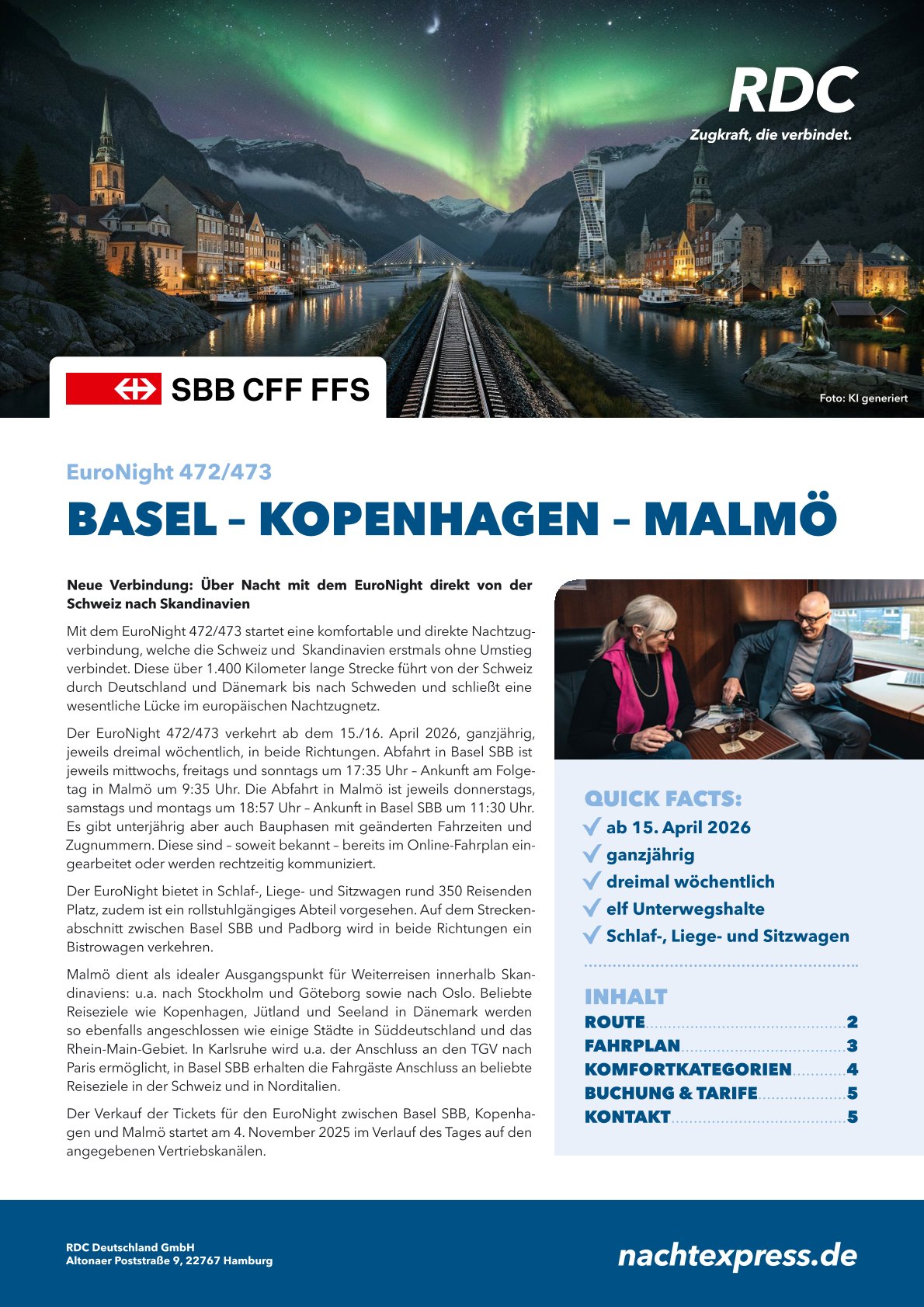 Abends stressfrei in den Zug einsteigen und erholt am Ziel ankommen. Schlafend vergeht die Zugfahrt umweltfreundlich und dennoch garantiert wie im Flug. Das Angebot an Nachtverbindungen ist reichlich und wird kontinuierlich erweitert.