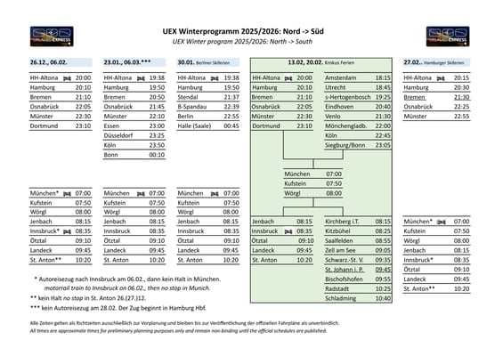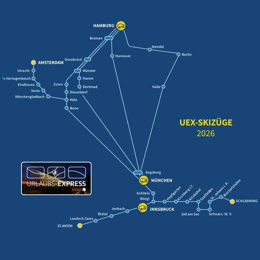 Der UEX ist eine Marke der Kölner Train4you Vertriebs GmbH und seit 2017 Spezialist für Auto- und Nachtzüge quer durch Europa. Mit zehn Verbindungen ist der Urlaubs-Express ab 2026 Deutschlands Nummer 1 unter den Autoreisezügen. Im Winter fährt der UEX von vielen deutschen Bahnhöfen – und erstmals auch aus den Niederlanden – direkt in Österreichs beliebteste Skiregionen.